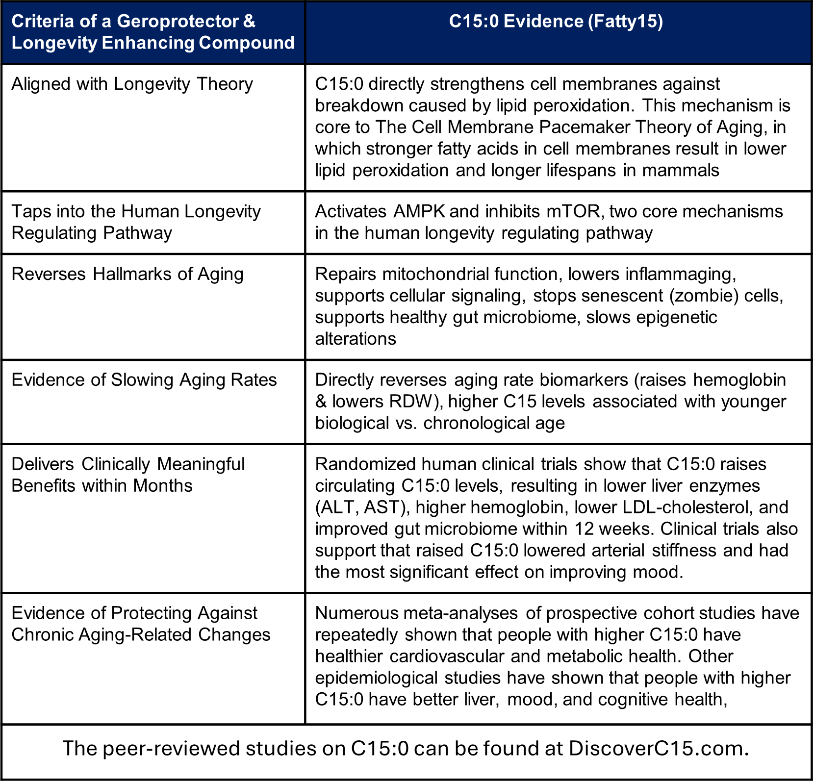 Geroprotectors are considered the “holy grail of healthy aging” because they effectively slow and reverse the aging process at the cellular level, resulting in tangible benefits. Leading longevity-enhancing candidates (e.g. rapamycin and metformin) show promise because they have evidence of being geroprotectors: providing both clinically relevant health benefits and tapping into key longevity pathways, such as mTOR inhibition and AMPK activation, respectively. Numerous studies, including cell-based and in vivo studies, prospective cohort study metaanalyses, and clinical trials, have demonstrated how C15:0 meets the criteria of a geroprotector, which are described in the table below.