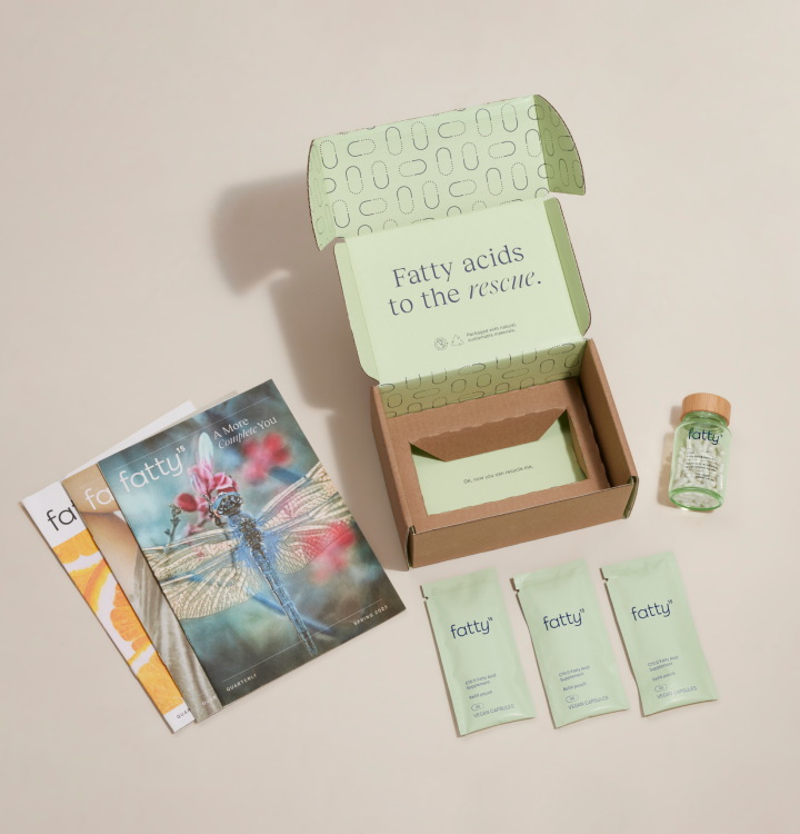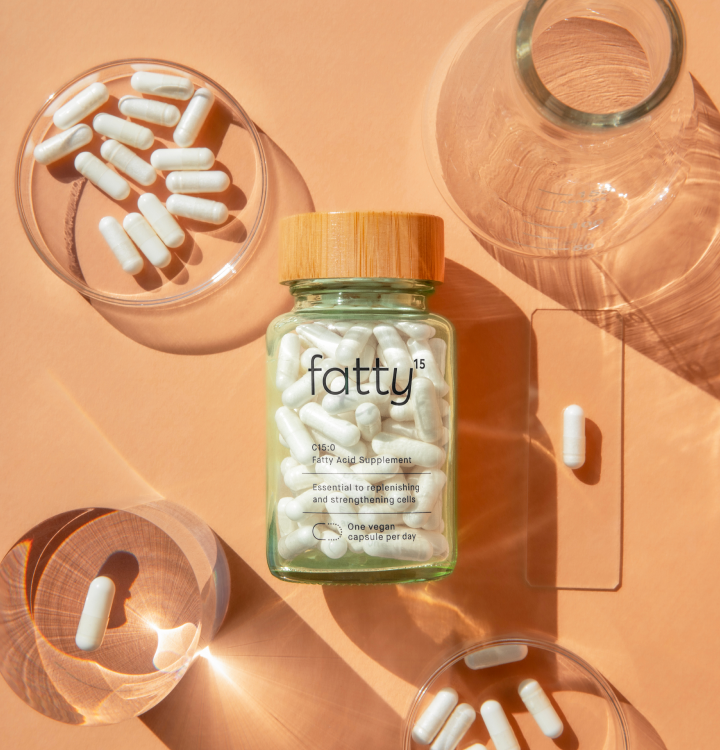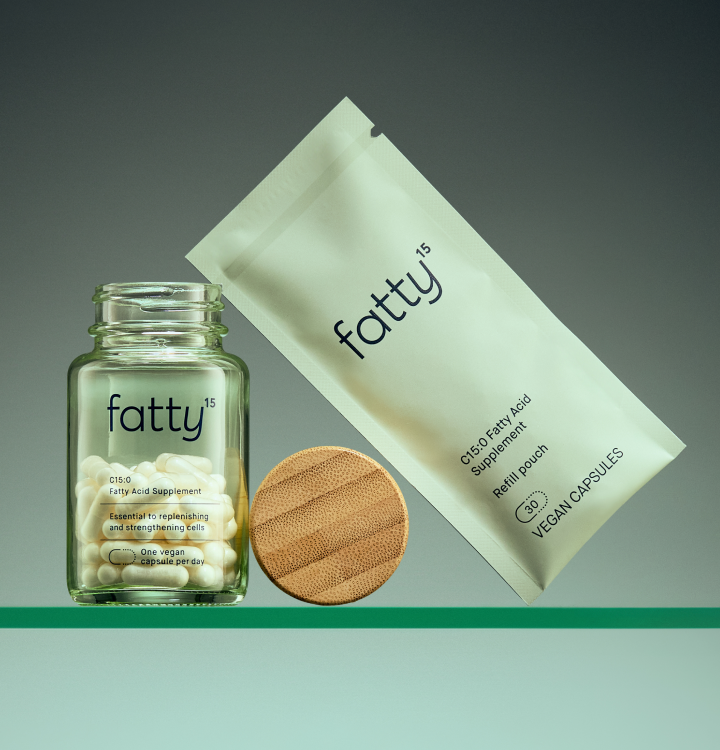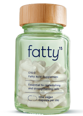 Fatty15 (C15:0) is an odd-chain saturated fatty acid, while omega-3s are polyunsaturated fatty acids. While both are beneficial fats that support healthy immune responses, they also have very different roles. For example, fatty15 is a sturdy fat that strengthens our cell membranes and protects them against age-driving lipid peroxidation. In contrast, omega-3s are less stable fats that make our cell membranes flexible but more susceptible to oxidation, especially as we age. The bottom line: Our bodies use both C15:0 and omega-3s to stay healthy, and they can and should compliment each other. The upsides of fatty15 with pure C15:0? Tiny pills with no smell, no taste, and no burps. Better yet, when tested head-to-head against pure EPA, fatty15 had 3x more cellular benefits relevant to our immune, metabolic, heart, and liver health. We recommend working with your healthcare provider to determine what supplement stack is best for you.